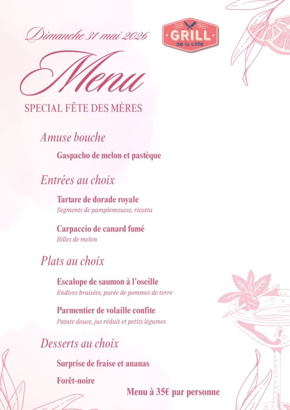 À l'occasion de la fête des mères, Le Grill de la Côte (côté restaurant) vous propose un menu spécial, dimanche 31 Mai.